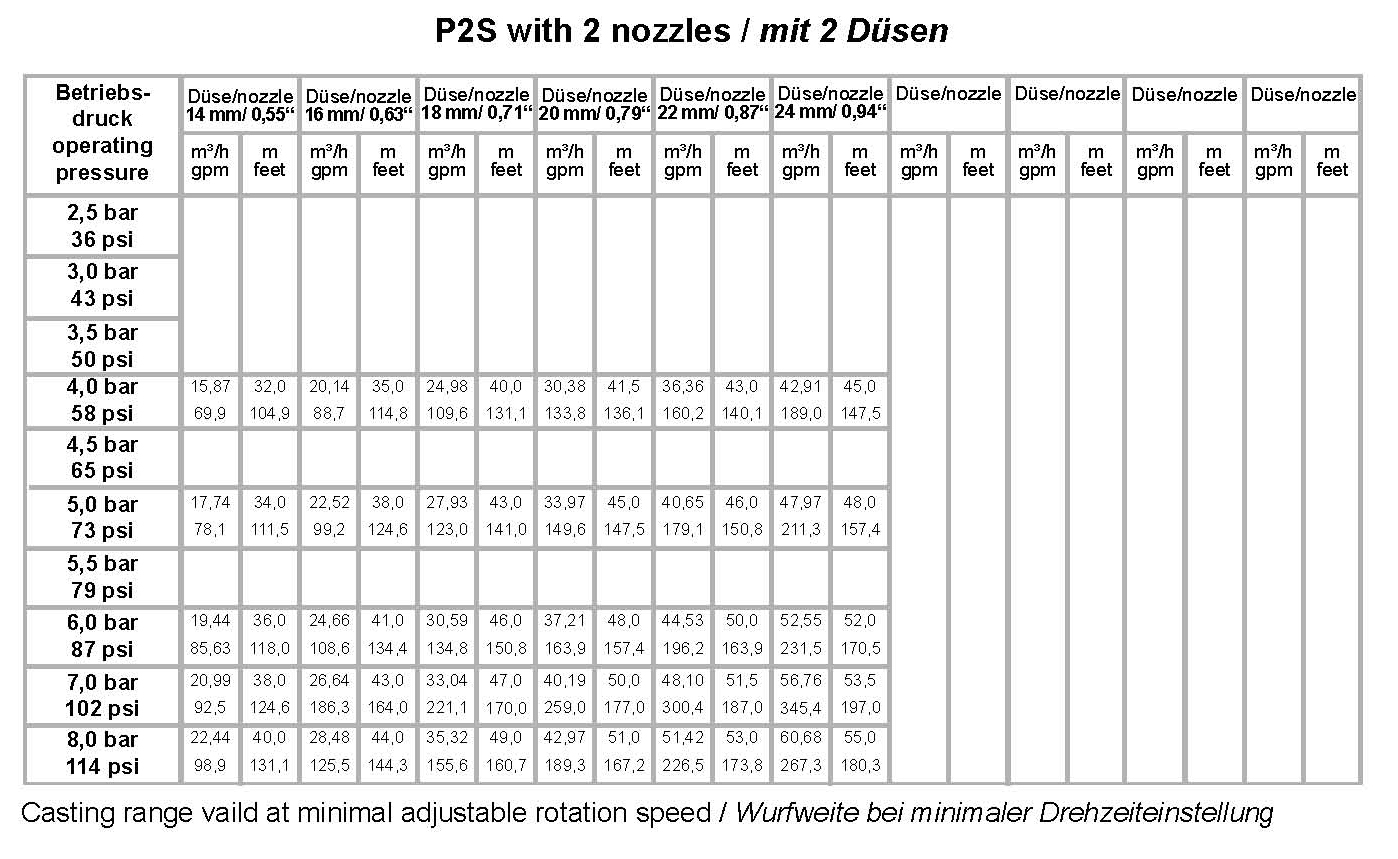 Aspersorul din seria P2 este singurul din domeniu ce foloseste piston pentru antrenarea jetului de apa pe distante foarte mari. Gama de aplicatii a acestui aspersoar este vasta : aplicatiile din agricultura ( tamburi, pivoti, etc), irigatii pentru spatii foarte mari, cat si aplicatii de mediu ( controlul prafului, depozite de lemne, etc) si irigatii cu apa reciclata.Functiunile deosebite ale acestei tehnici noi sunt jetul constant fara oscilatii si vibratii, udare eficienta chiar si in conditii de vant, etc.