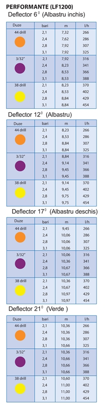 LF1200 : 270 l/h pana la 480l/h ( in mm: 1.98/ 2.18/ 2.39/ 2.59/ 2.76 )