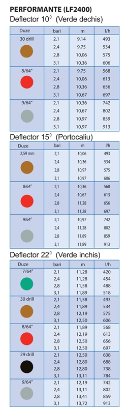 LF2400 : 450 l/h pana la 910l/h ( in mm: 2.76/ 2.97/3.18/ 3.38/ 3.63)